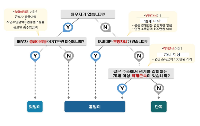 홀벌이가구 배우자의 총 급여액이 300만원 미만인 가구, 배우자가 없어도 부양자녀 또는 70세이상 직계존석이 있는 가구, 부양자녀이든 직계존속이든 각각의 연간 소득금액이 100만원 이하이고, 주민등록표상 동거가족으로 생계를 같이하는 가구